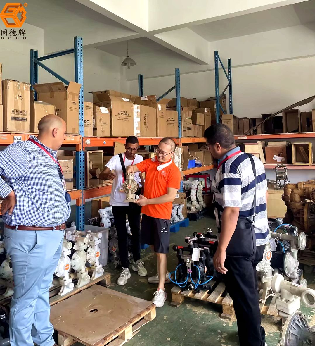 邊鋒國(guó)際事業(yè)部負(fù)責(zé)人代表公司帶領(lǐng)幾位中東客戶參觀了水泵博物館、工廠生產(chǎn)線、生產(chǎn)設(shè)備、倉(cāng)儲(chǔ)設(shè)施等。向客戶展示了我們的主要產(chǎn)品線以及最新的技術(shù)成果,并為客戶詳細(xì)講解產(chǎn)品的性能特點(diǎn)、應(yīng)用工況。幫助客戶更好地了解并選擇更合適的隔膜泵產(chǎn)品。